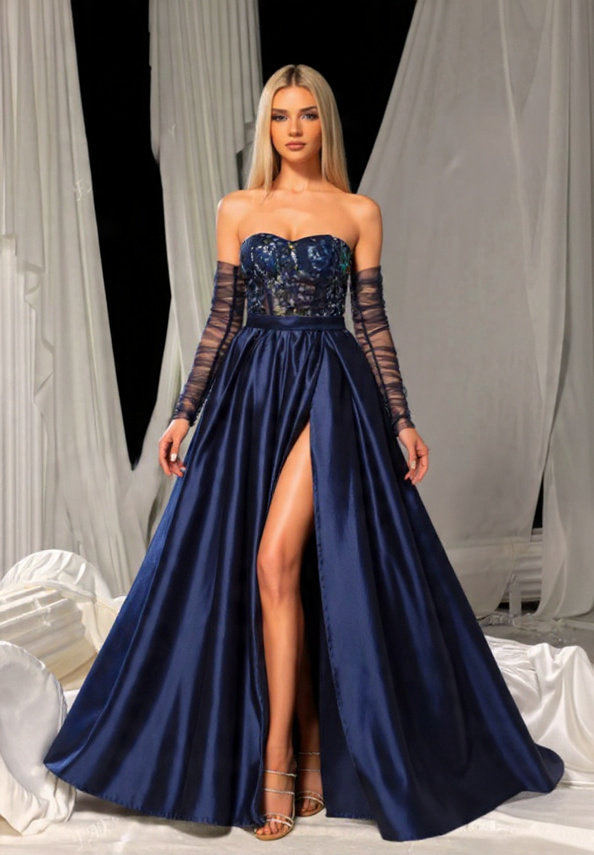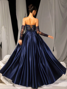 Obleka Natalie je zelo glamurozna večerna obleka, sestavljena je iz prosojnega ćipkastega korzeta, v spodnjem delu ima bogato gubano satenasto krilo z visokim razporkom. Poseben detajl so snemljivi gubani rokavi.