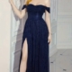 Ta prestižna temno modra večerna obleka je ustvarjena za trenutke, ko želiš pustiti nepozaben vtis. Bleščeč material v kombinaciji s prefinjenimi prosojnimi linijami ustvari čutno, a še vedno sofisticirano silhueto. Oprijet kroj poudari tvojo postavo, visok razporek pa doda ravno prav drznosti za popoln rdeče-preproga efekt.