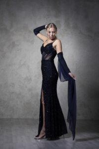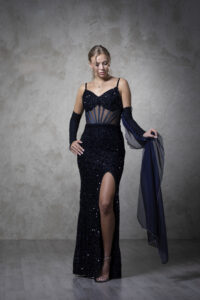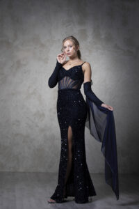 Ta prestižna temno modra večerna obleka je ustvarjena za trenutke, ko želiš pustiti nepozaben vtis. Bleščeč material v kombinaciji s prefinjenimi prosojnimi linijami ustvari čutno, a še vedno sofisticirano silhueto. Oprijet kroj poudari tvojo postavo, visok razporek pa doda ravno prav drznosti za popoln rdeče-preproga efekt.
