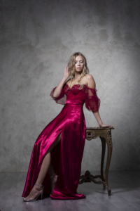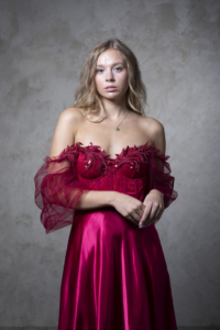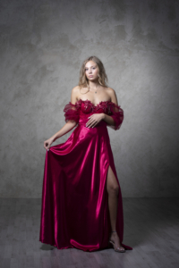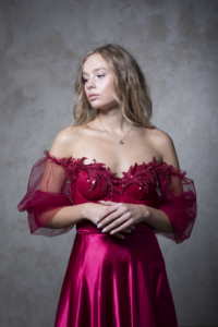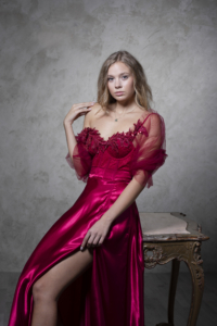 Ta maturantska obleka je elegantna in ženstvena. Zgornji del krasijo bogati, bleščeči čipkasti vzorci in tilasti odstranljivi rokavi. Obleka ima gladek, padajoč, v polni krog krojen spodnji del z visokim razporkom, ki ustvarja prefinjen in romantičen videz.