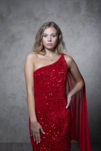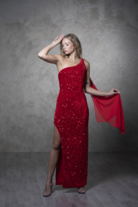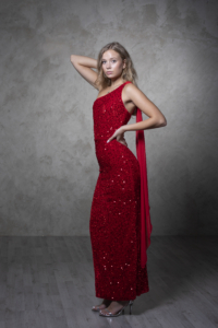 Modna hiša: Fashion New YorkAsimetrična elegantna večerna obleka v rdeči barvi pokaže skladno postavo in vas postavi v ospredje svečanega dogodka. Šal se lahko odstrani.