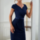 Telirana elegantna obleka iz mat satena, z gubanim pasom iz svetlečega satena, zgornji del drapiran. Nežen padajoč zgornji del se lepo dopolnjuje s stisljivim ojačanim spodnjim delom, primeren model za polnejše postave v spodnjem delu.